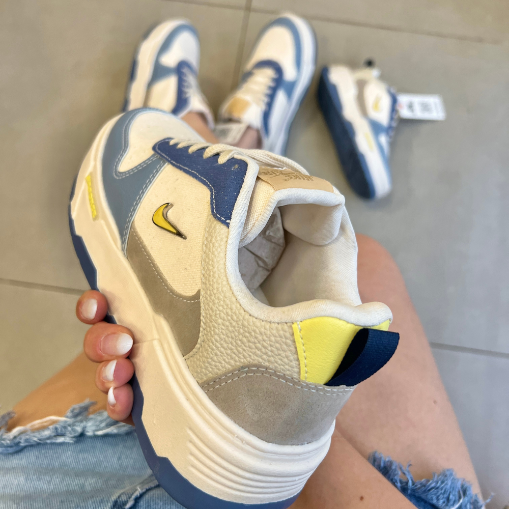 O TĂȘnis Nike AF1 Plataforma Azul Jeans Premium apresenta um design Ășnico, combinando lona de alta qualidade com detalhes em couro azul e camurça. Esta combinação de materiais cria um visual deslumbrante que se destaca em qualquer ocasiĂŁo.