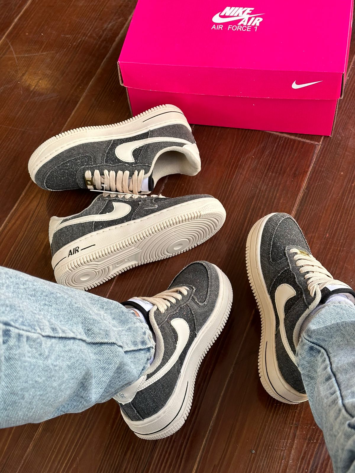 O TĂȘnis Nike Air Force 1 Jeans Preto Premium apresenta um design distintivo com material jeans e o logo em couro. Esses detalhes adicionam um toque de sofisticação ao calçado, tornando-o ideal para mulheres que buscam estilo e qualidade.